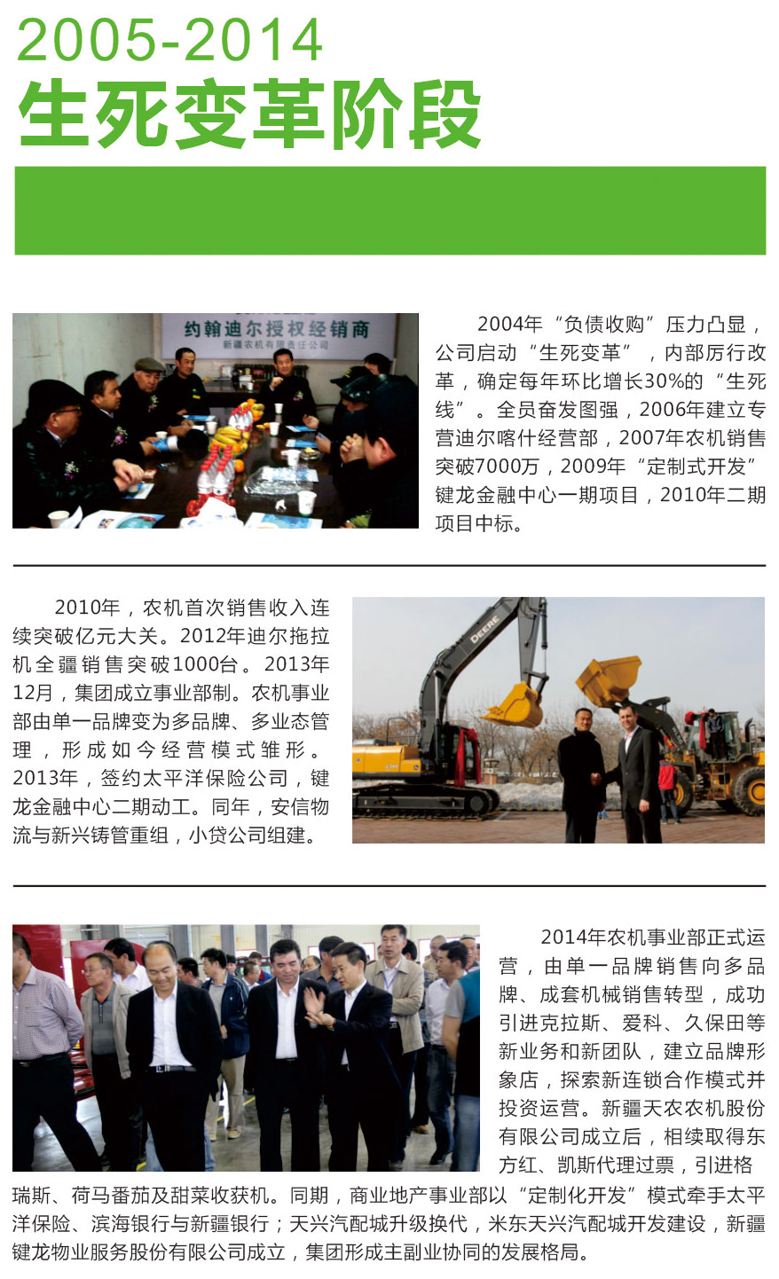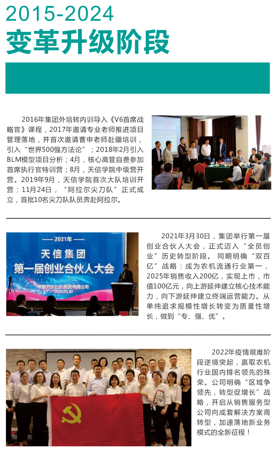 公司自2018年轉型升級以來,逐步從傳統(tǒng)的農機銷售服務向成套農業(yè)機械化解決方案商轉型,通過5年的變革發(fā)展,2022年公司進一步明確了戰(zhàn)略發(fā)展定位,打造“從耕種到收獲的全產(chǎn)業(yè)鏈綜合服務解決方案商”雙百億戰(zhàn)略的新目標。