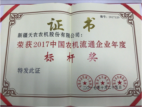 2017中國(guó)農(nóng)機(jī)行業(yè)年度大獎(jiǎng)評(píng)選活動(dòng),經(jīng)過(guò)申報(bào)、初審、大眾網(wǎng)上投票、千人專家(專業(yè)人士)團(tuán)網(wǎng)上投票和百名專家現(xiàn)場(chǎng)分組評(píng)審,在本次評(píng)選中新疆天農(nóng)農(nóng)機(jī)股份有限公司以優(yōu)異的成績(jī),榮獲2017中國(guó)農(nóng)機(jī)流通企業(yè)年度標(biāo)桿獎(jiǎng)。